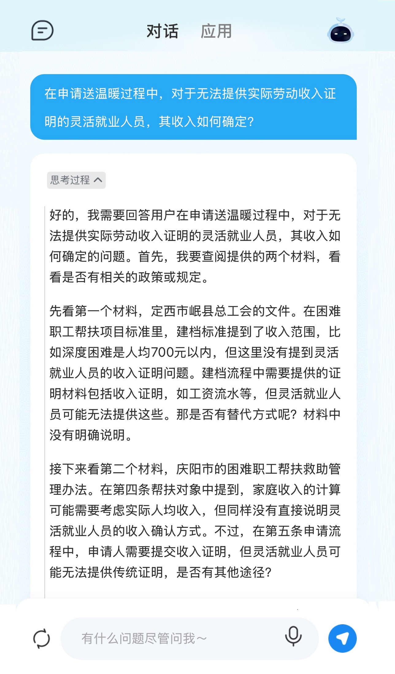 依托DeepSeek大模型的強大自然語言處理能力,AI助手能夠精準理解用戶意圖,快速解答職工關於政策法規、權益保障、福利待遇等方麵的疑問,提供個性化、專業化的谘詢服務。